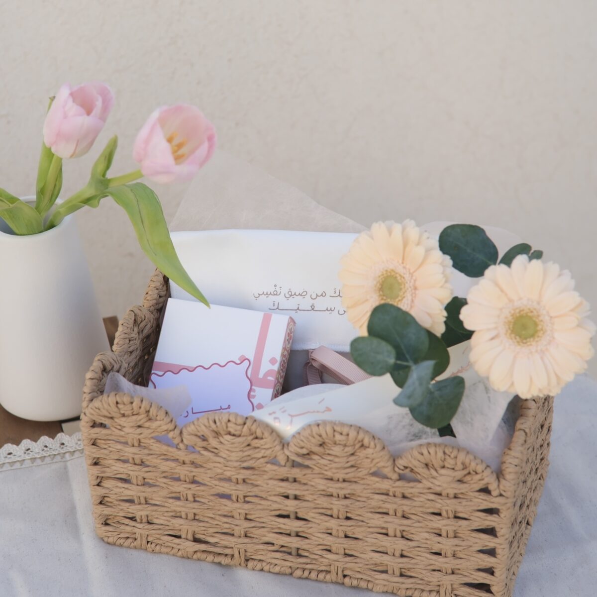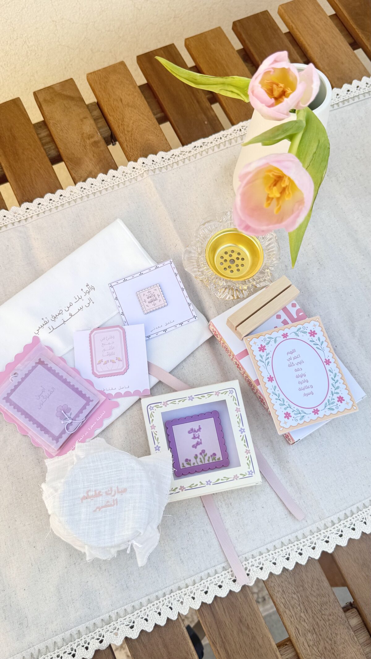 Fresh flowers with incense burner, chocolate jar,duaa cards, magnet bookmark, metal sticker, Scented Pendent, and Magnet.