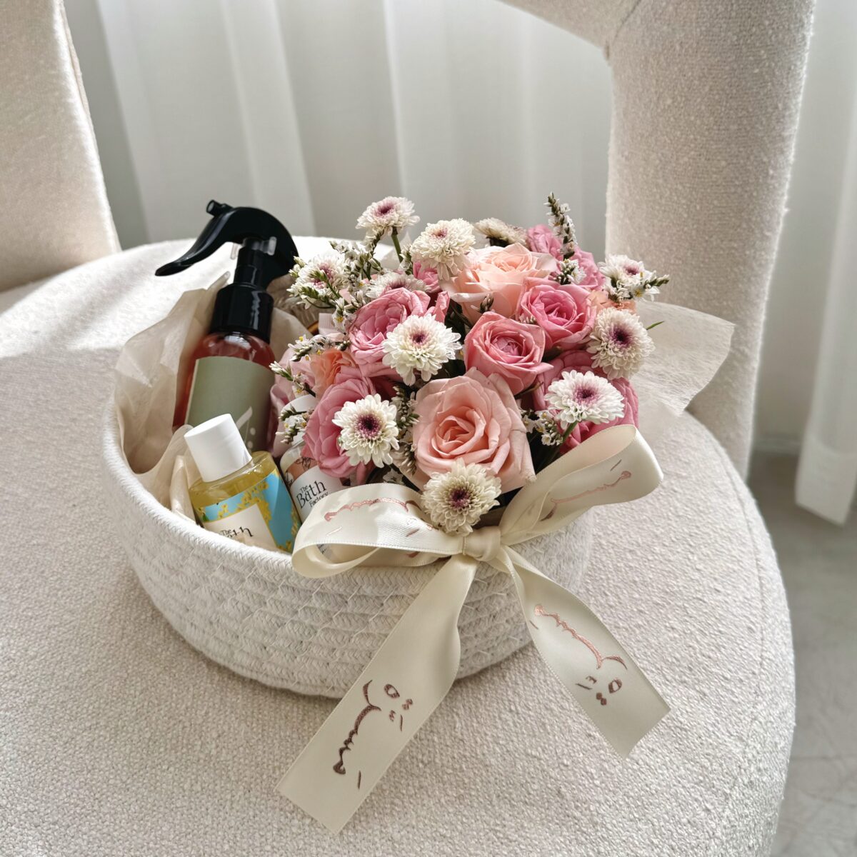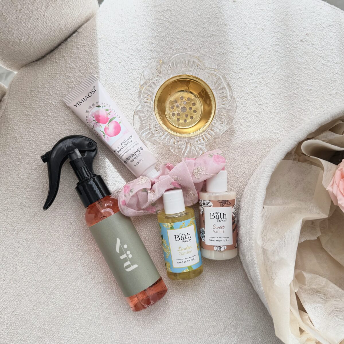 2 جل استحمام صغير، مرش معطر للغرفة، مبخر، ربطة للشعر