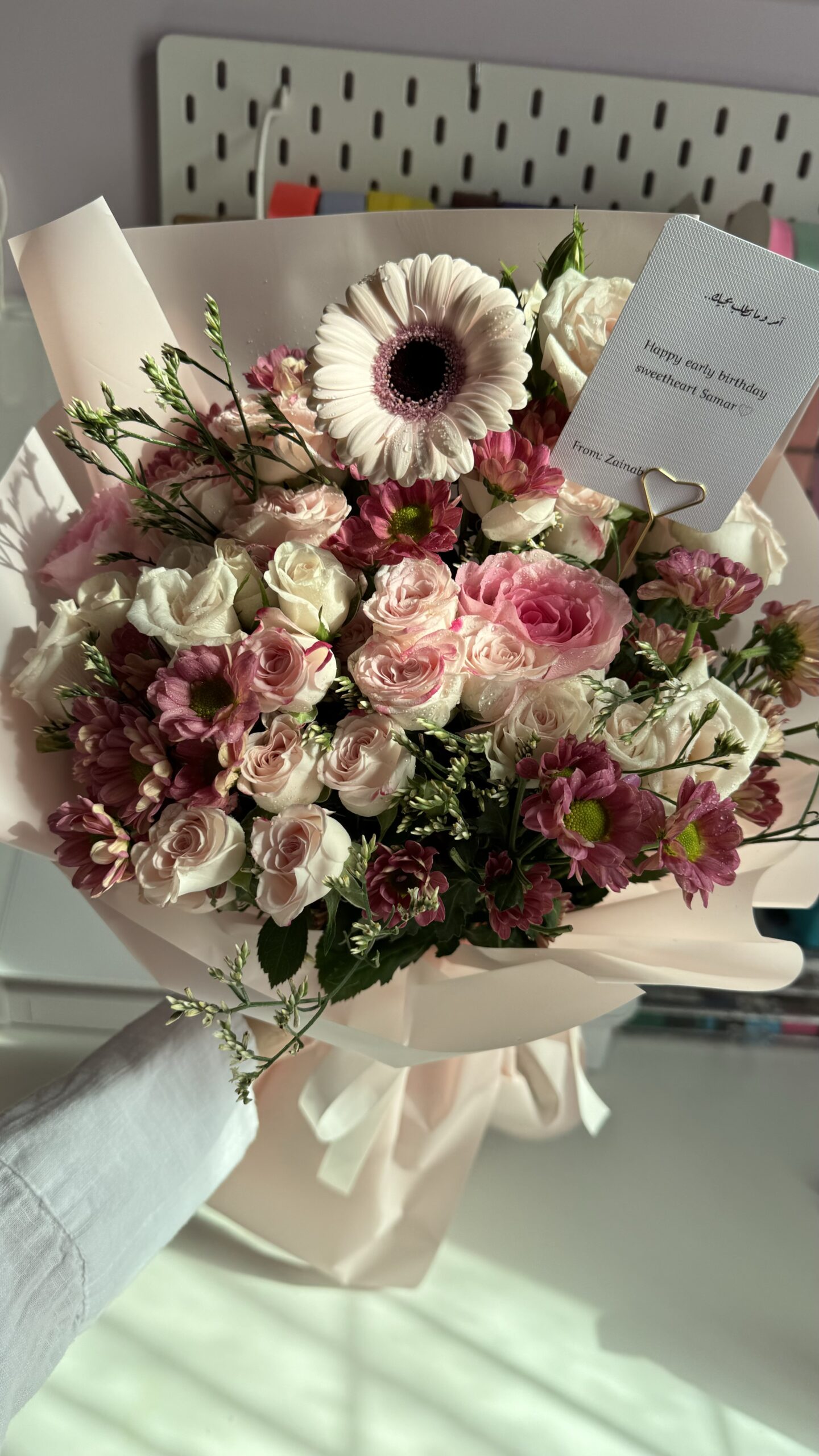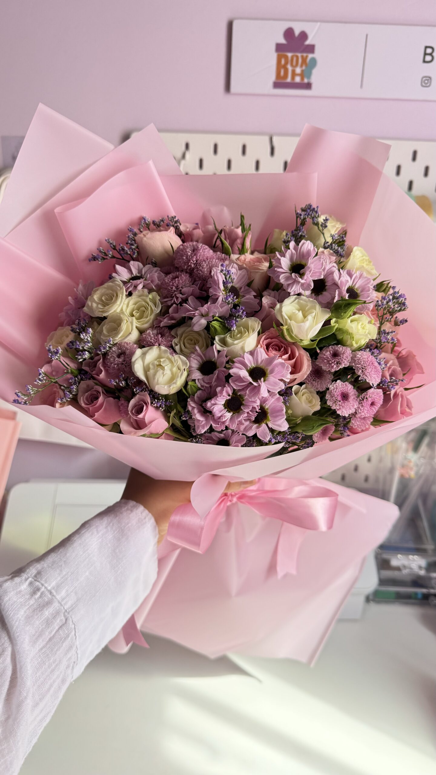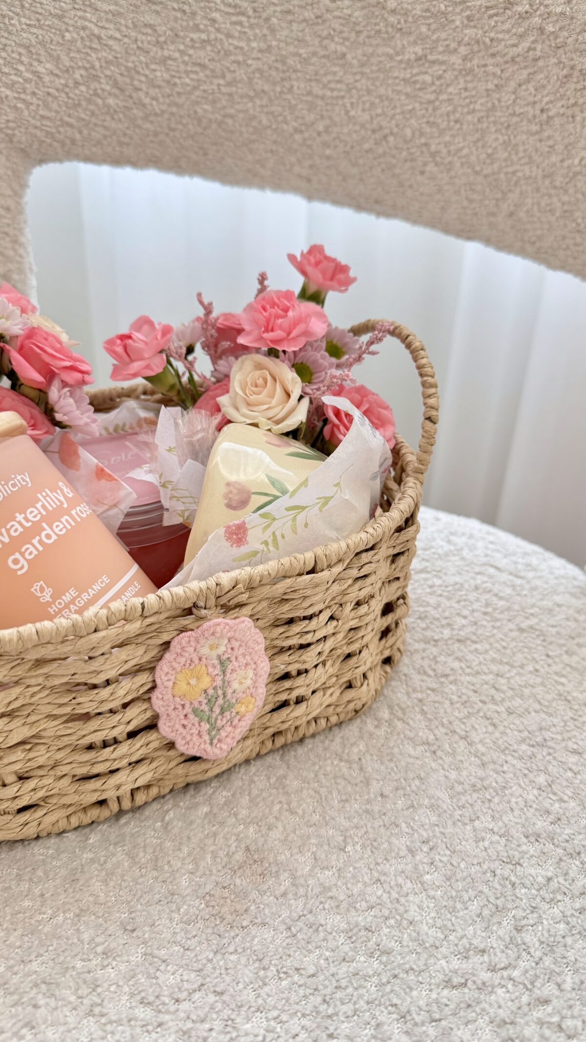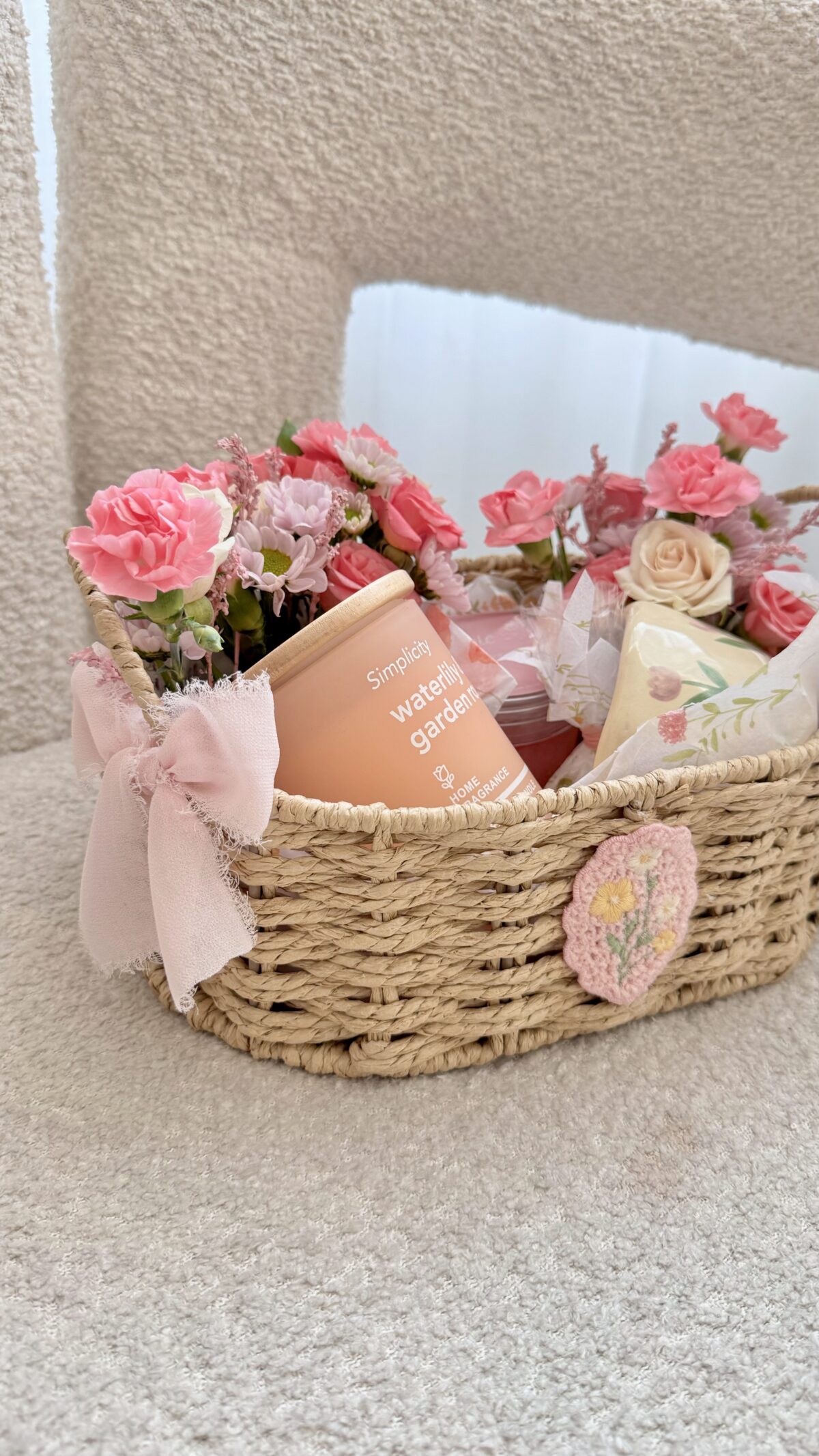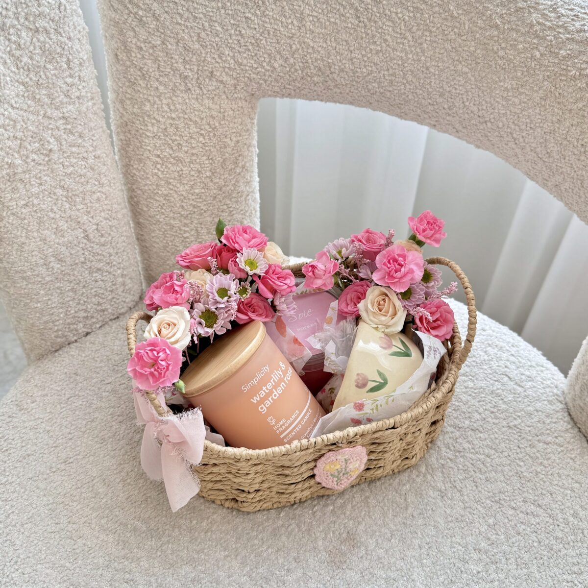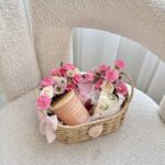 سلة مسرة تحتوي على كوب سيراميك، مقشر وردي ناعم للجسم، شمعة برائحة الزهور، وزهور طبيعية.