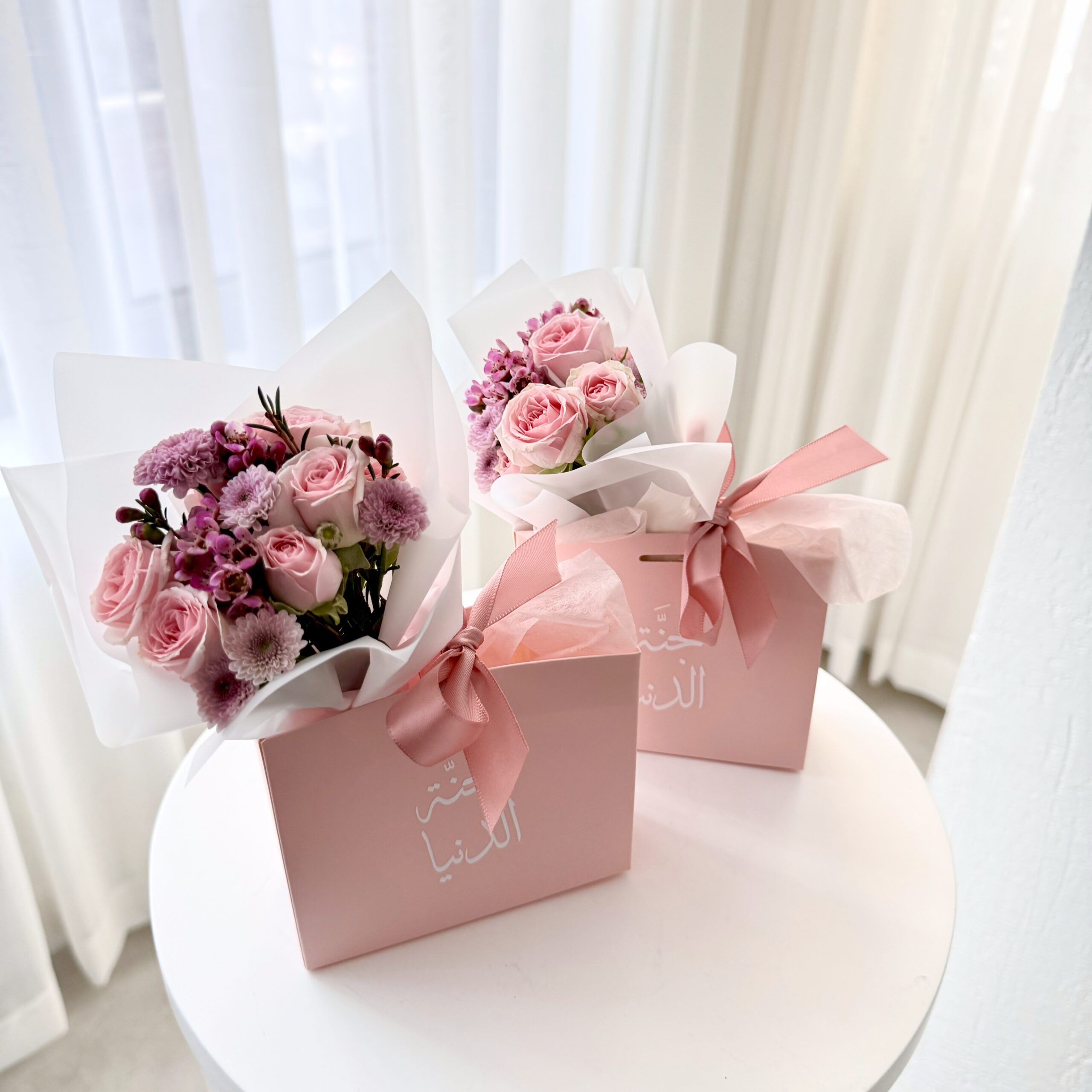 يحتوي على باقة زهور طبيعية صغيرة و3 قطع من الشوكولاتة